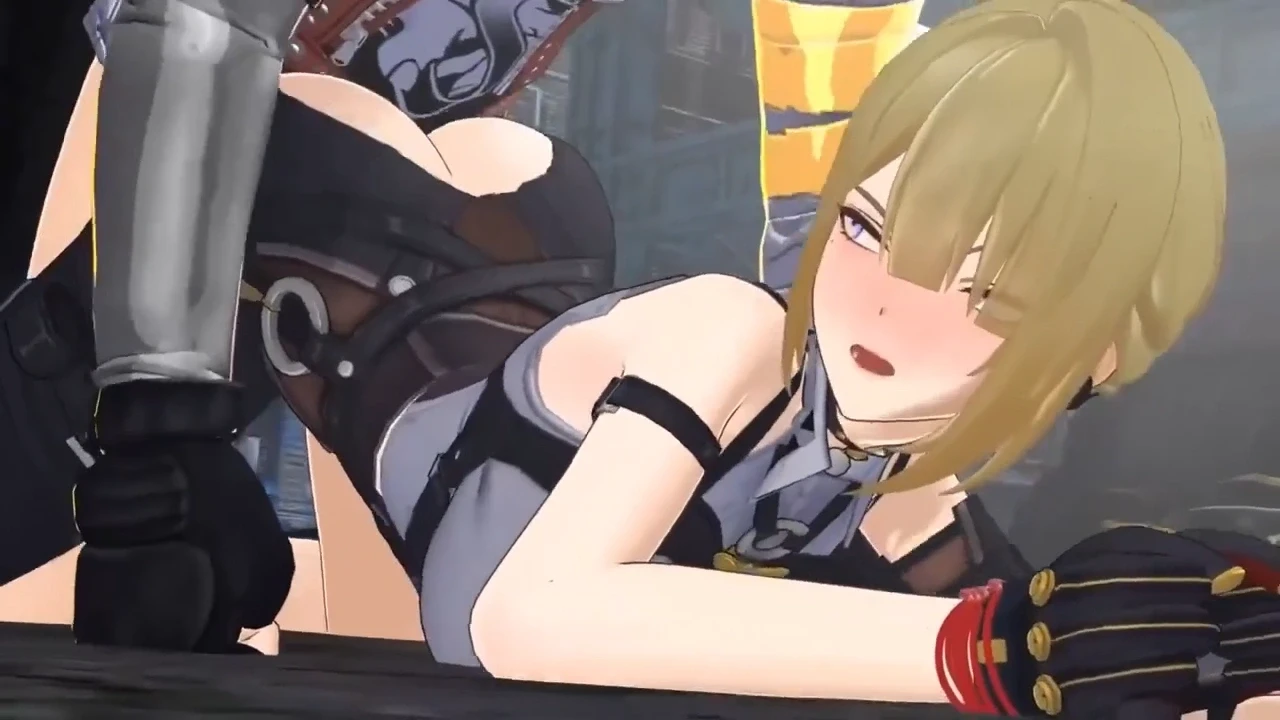 Evelyn Chevalier from Zenless Zone Zero is down on all fours with her hands tied behind her back, ripped clothes showing off her ass. A faceless Hollow Thug grabs her hips and fucks her hard from behind, pushing deep while Evelyn looks back at him with an angry, blushing face.